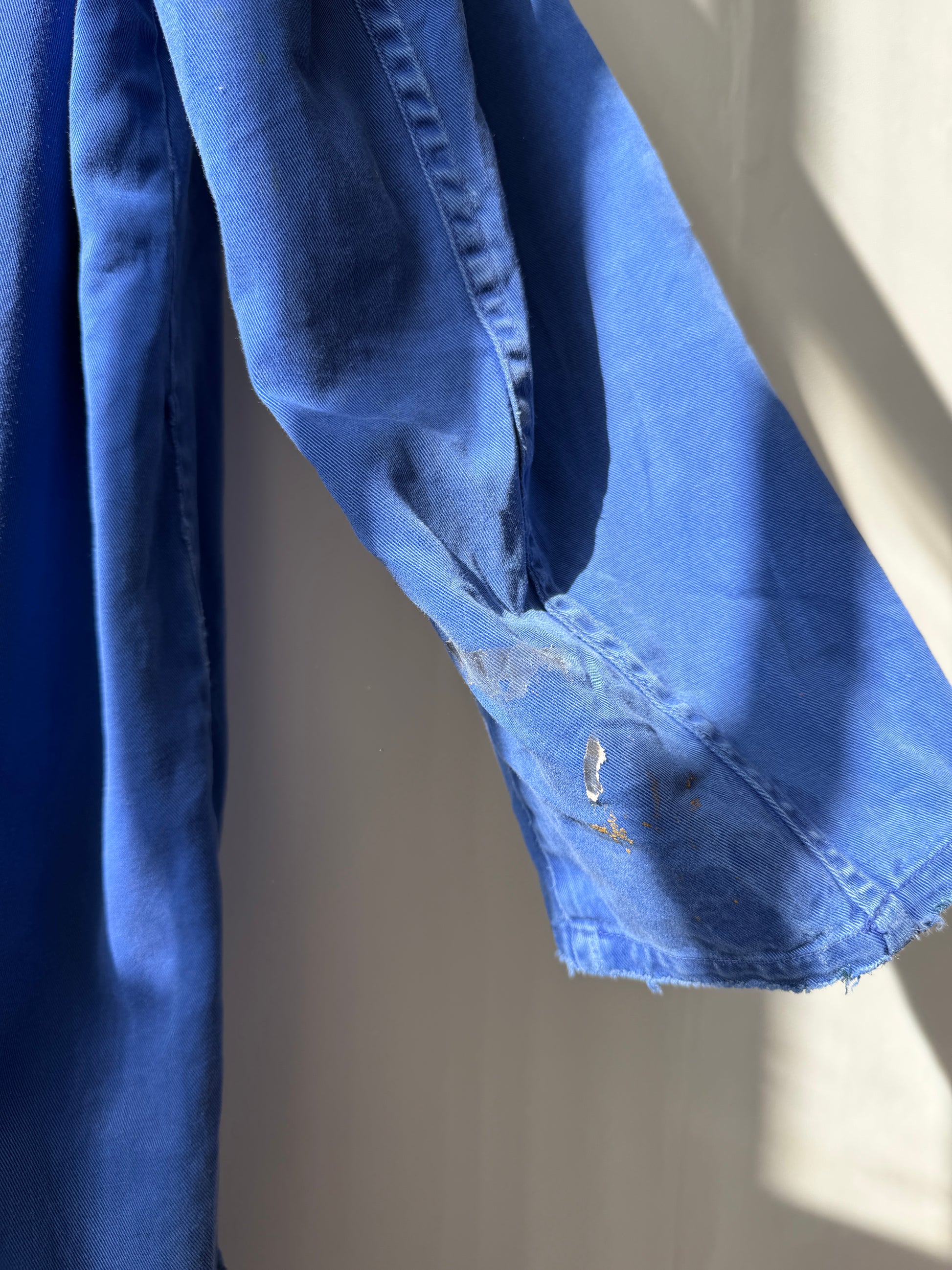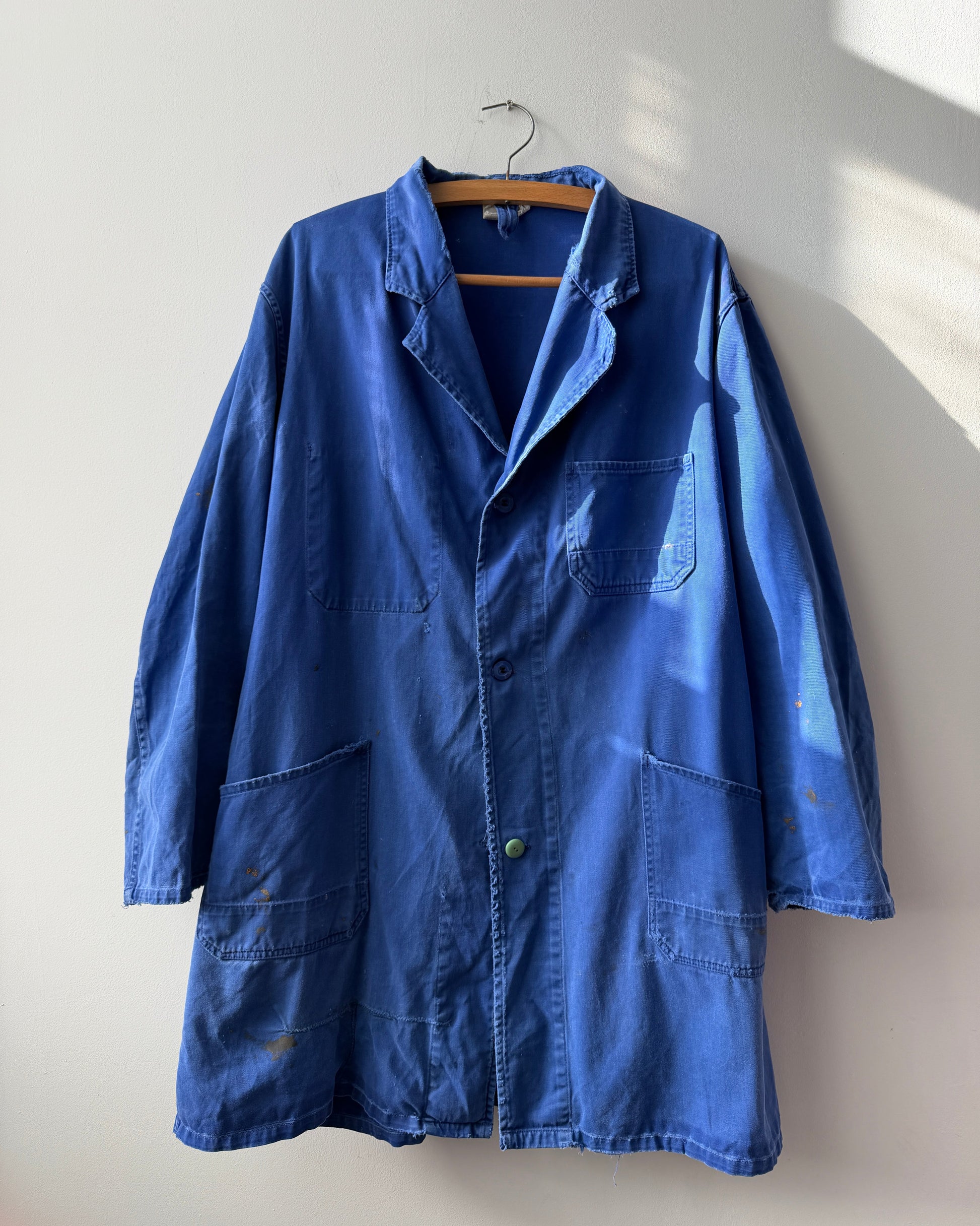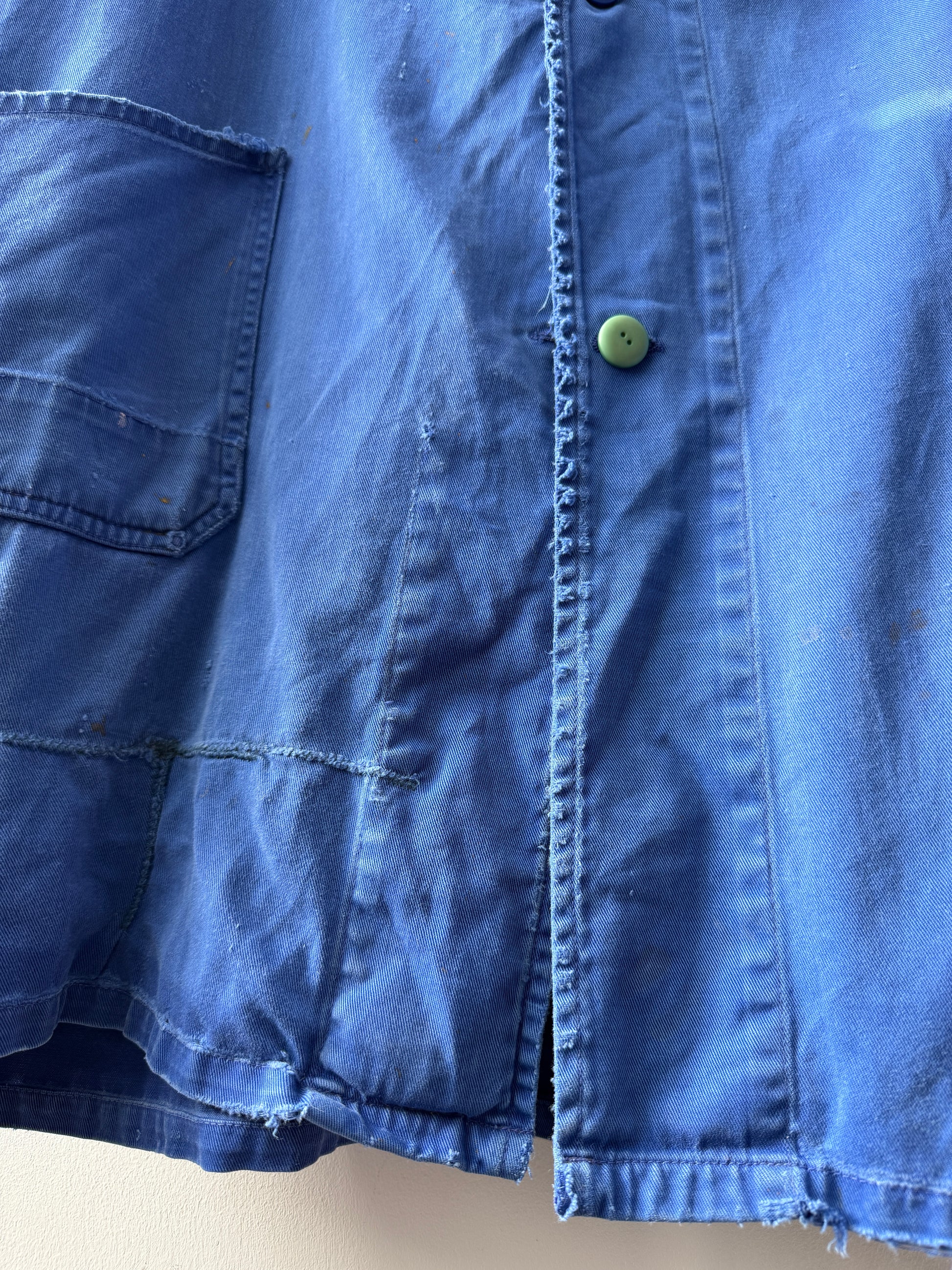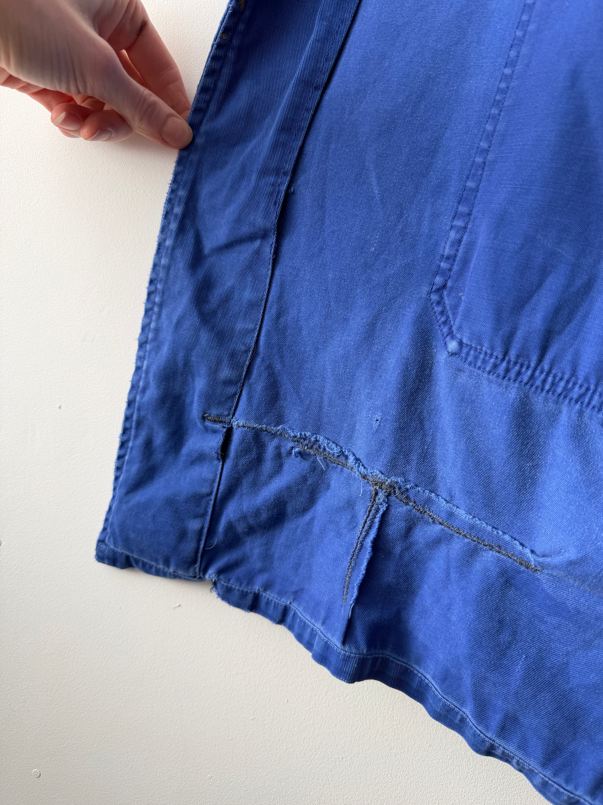 Distressed French workwear jacket in long length duster style. Distressed and repaired areas, with some damage around them hem and cuff as seen, tonnes of character and very unique piece that could be further repaired and patched and made into your own.