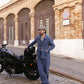 Womenswear model is 5ft 6 tall wears size 28". Menswear model 1 wears waist 36" and our rhubarb smock top. Menswear model 2 wears waist 34" as our full indigo workwear suit.