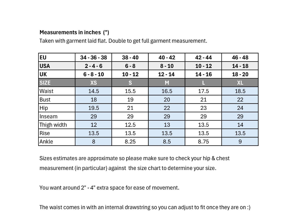 See size chart for full size info. The fit of these very much depends on your hip measurement so please use this as you main guide. Please don't forget that you make these fit your shape using the internal waist drawstring!! It's easy to miss but it's an essential part of the design :)