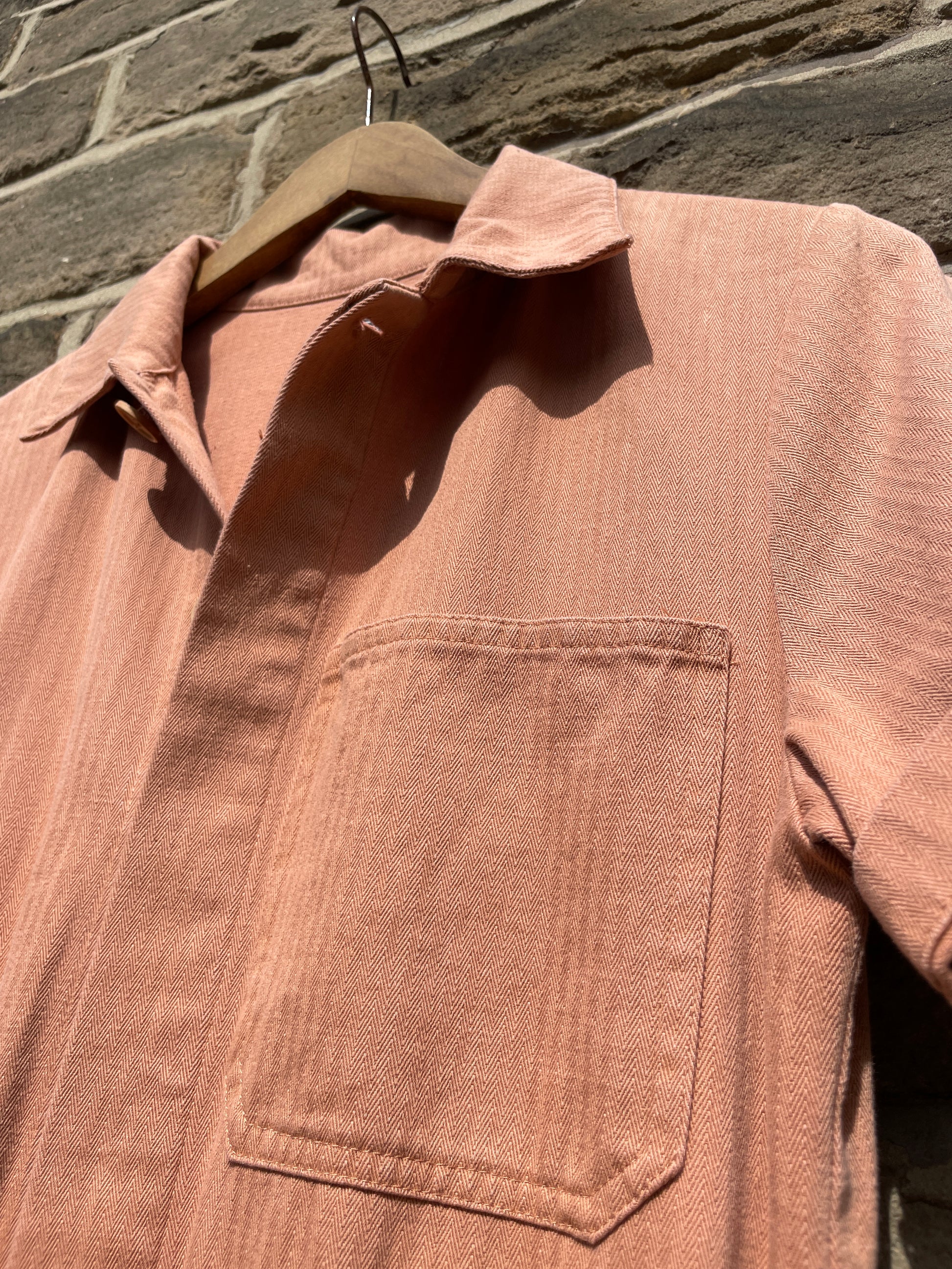 FABRIC: 100% herringbone cotton. Please check chart before purchase. As this fabric is washed to give the beautiful worn in effect, please allow for a possible 1" difference in the sizing chart.