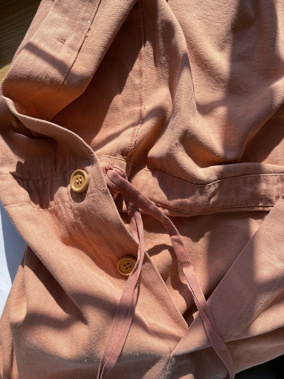 Made from our own unique pre washed, pre softened 100% cotton herringbone fabric. These fasten with buttons to front and pull in at the waist with an internal draw cord for a tailored fit. Can also be styled with a belt.
