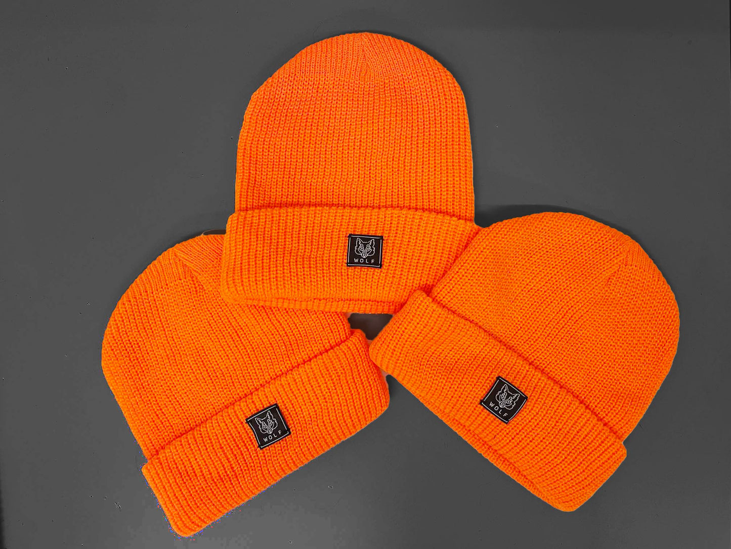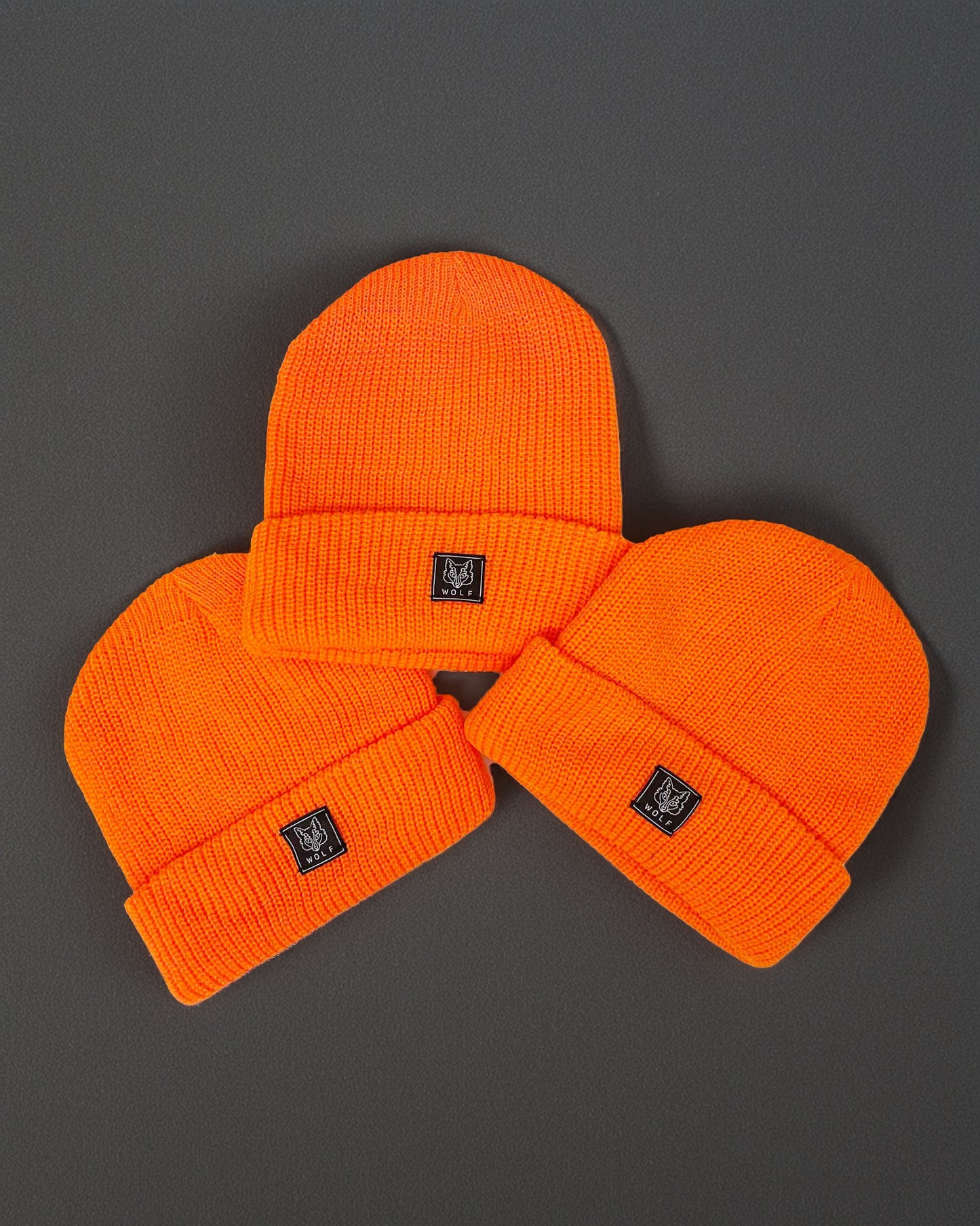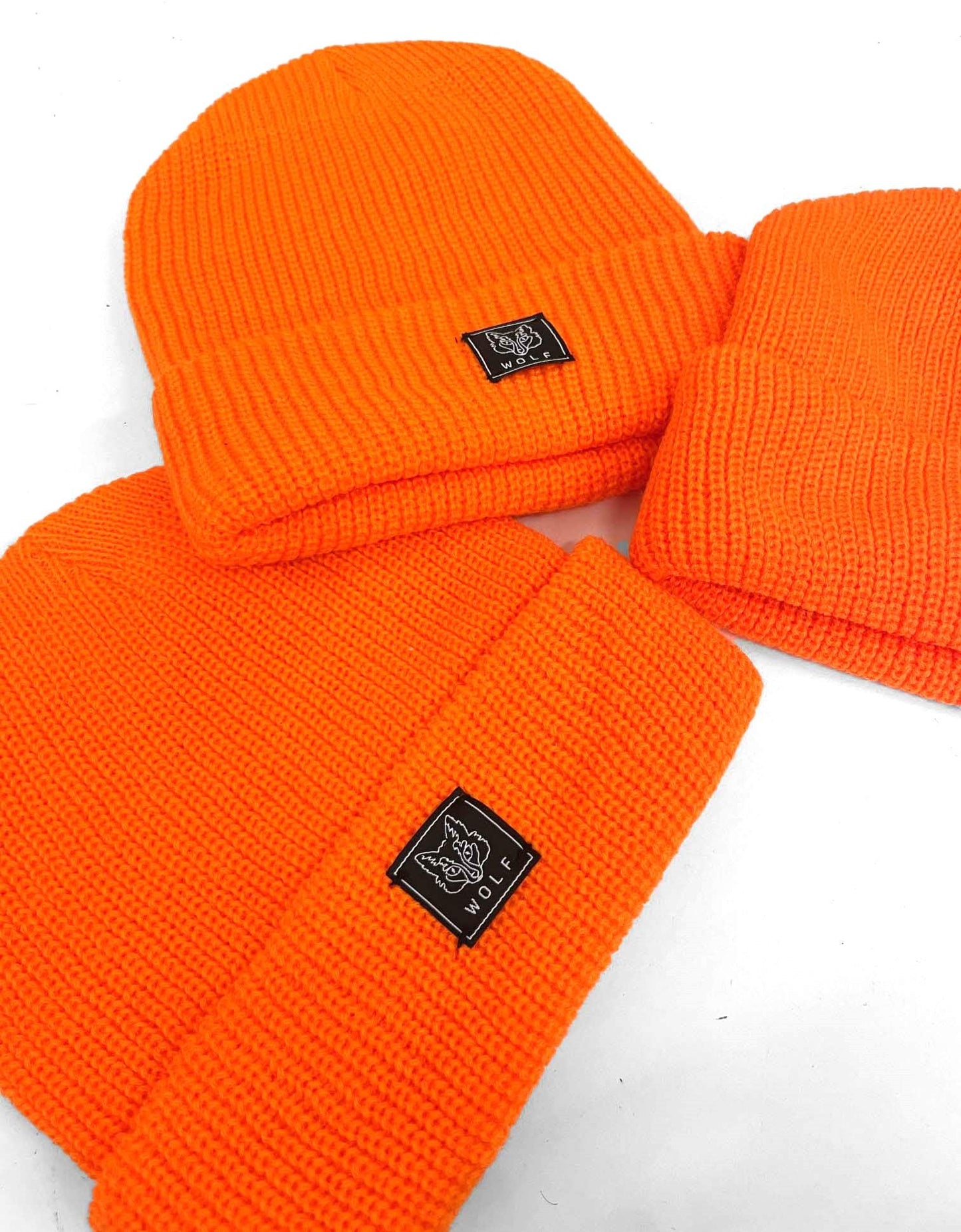 Military surplus beanie hats in vivid orange with WOLF logo to front. Perfect additional to your workwear jacket, also suitable for running. Other colours here.
