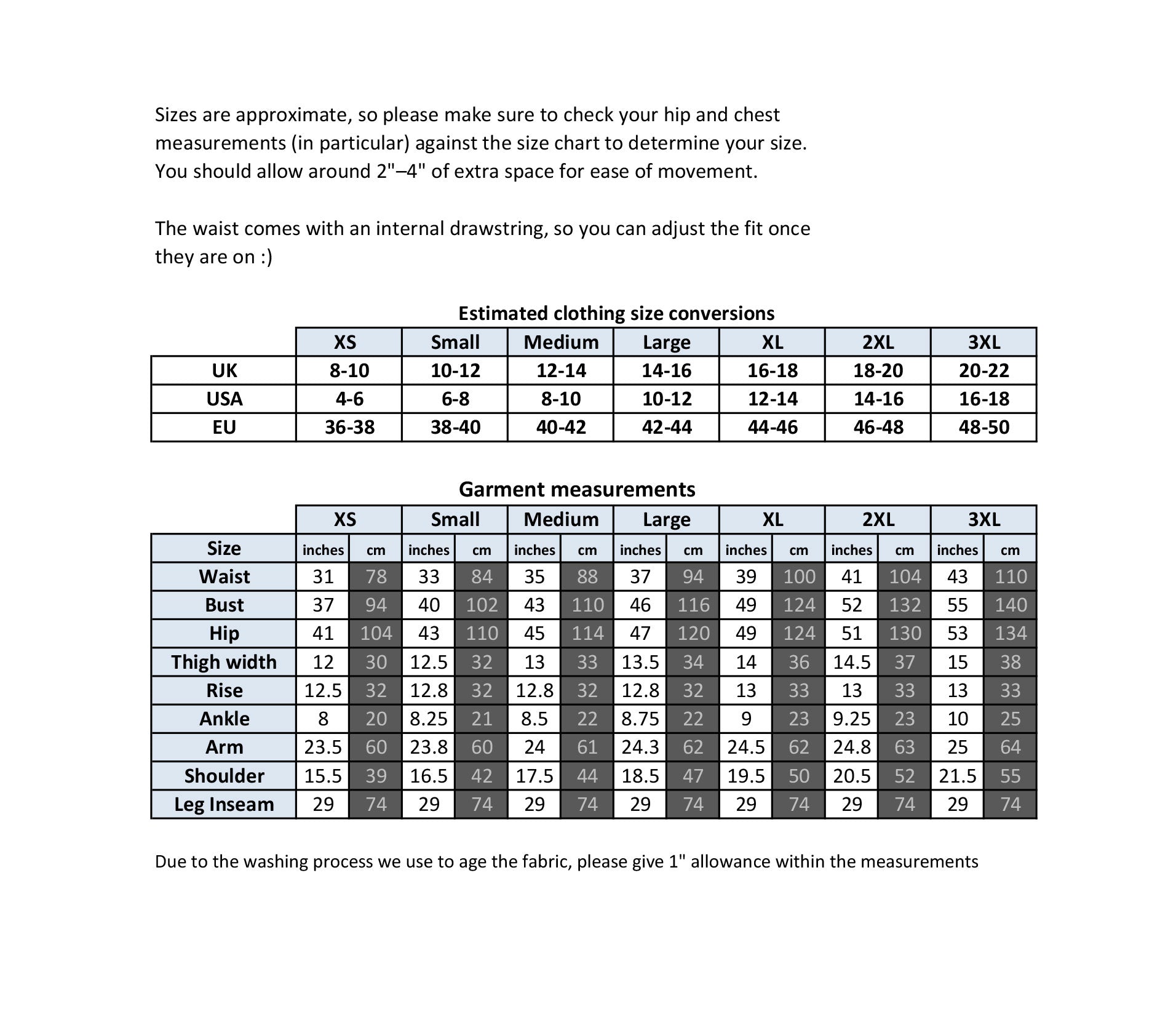 See size chart for full size info. The fit of these very much depends on your hip measurement so please use this as you main guide. Please don't forget that you make these fit your shape using the internal waist drawstring!! It's easy to miss but it's an essential part of the design :)