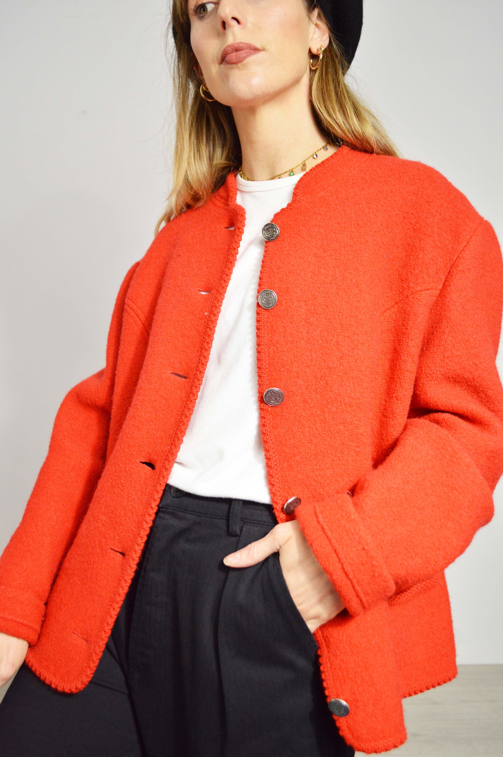 Vintage European liner style 100% wool jacket from circa 1980. Perfect layer with an easy-to-style simple round neckline. Wool is naturally thermal and warm.