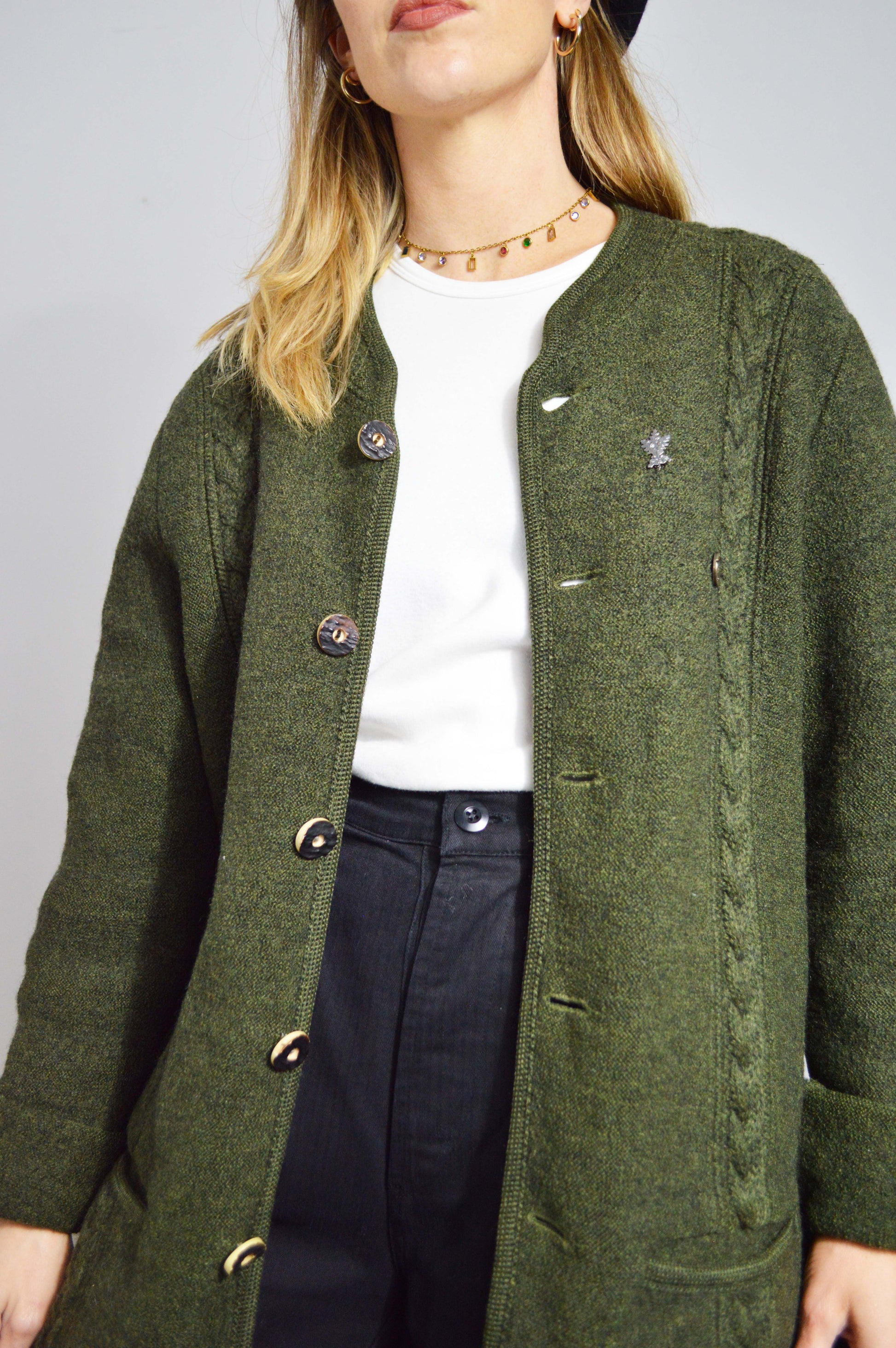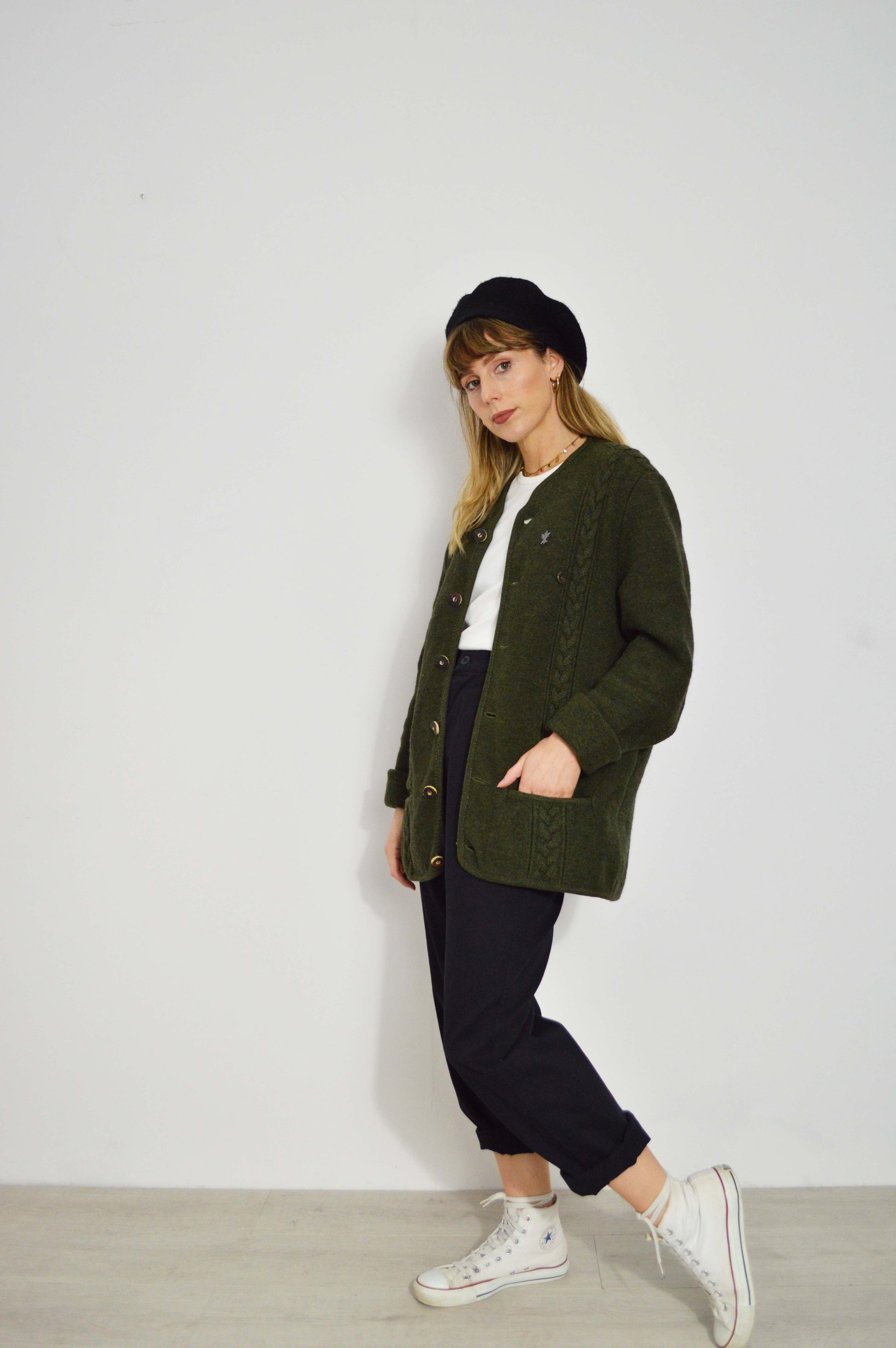 Vintage European liner style 100% wool jacket from circa 1980. Perfect layer with an easy-to-style simple round neckline. Wool is naturally thermal and warm. Really sweet original metal badge details which are removable if you prefer without.