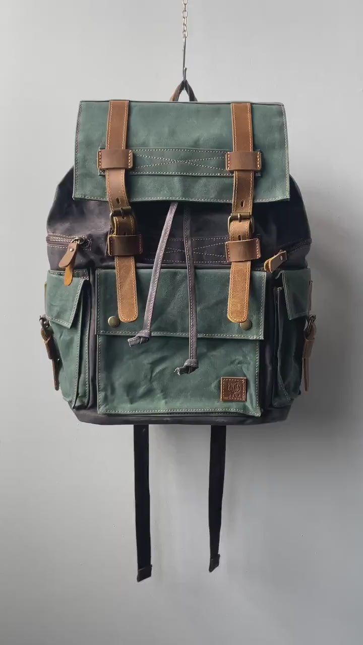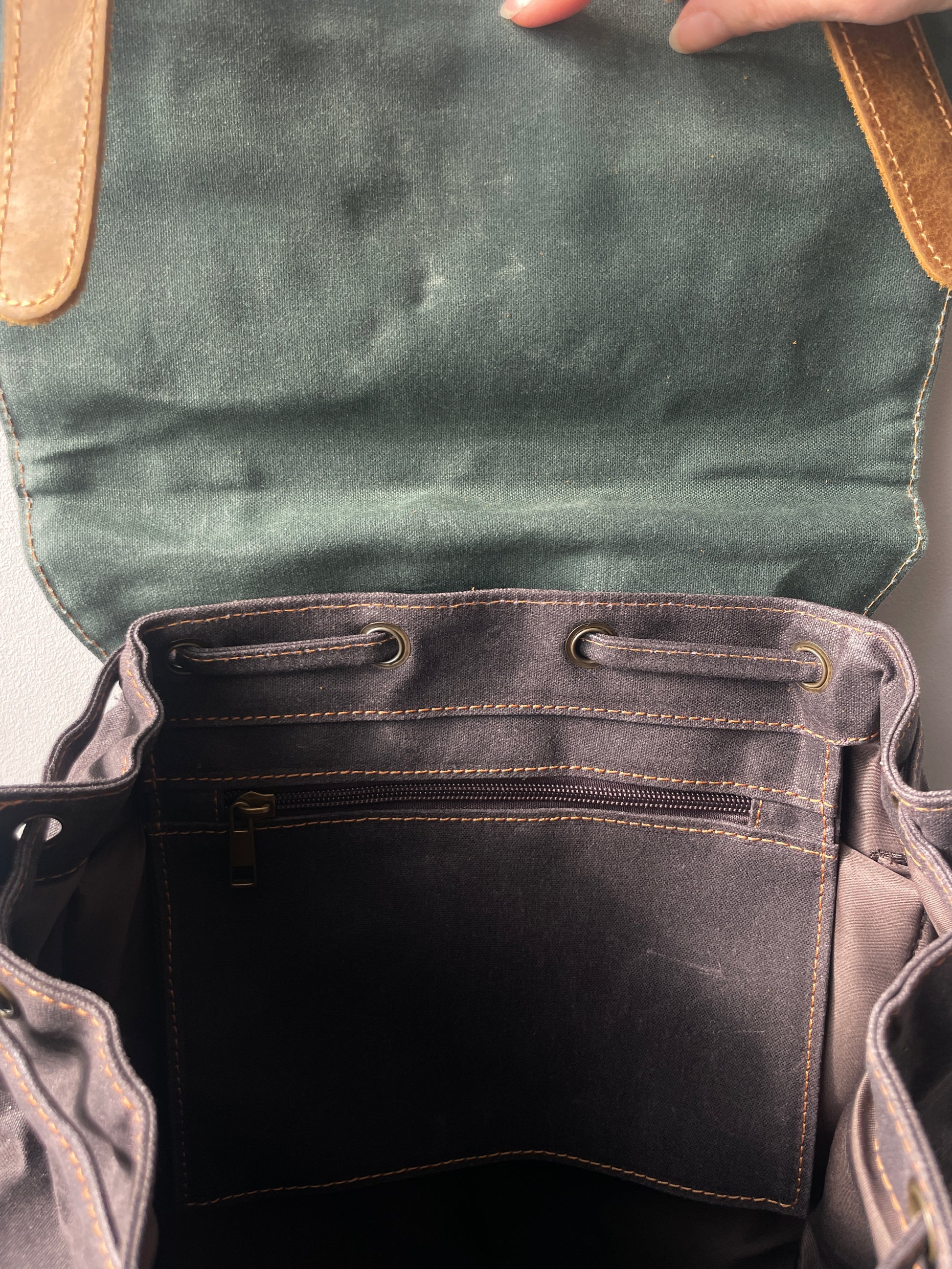 Waxed Cotton Large Rucksack - Turquoise, Brown & Black Canvas -3 way colour design with lots of useful pockets.