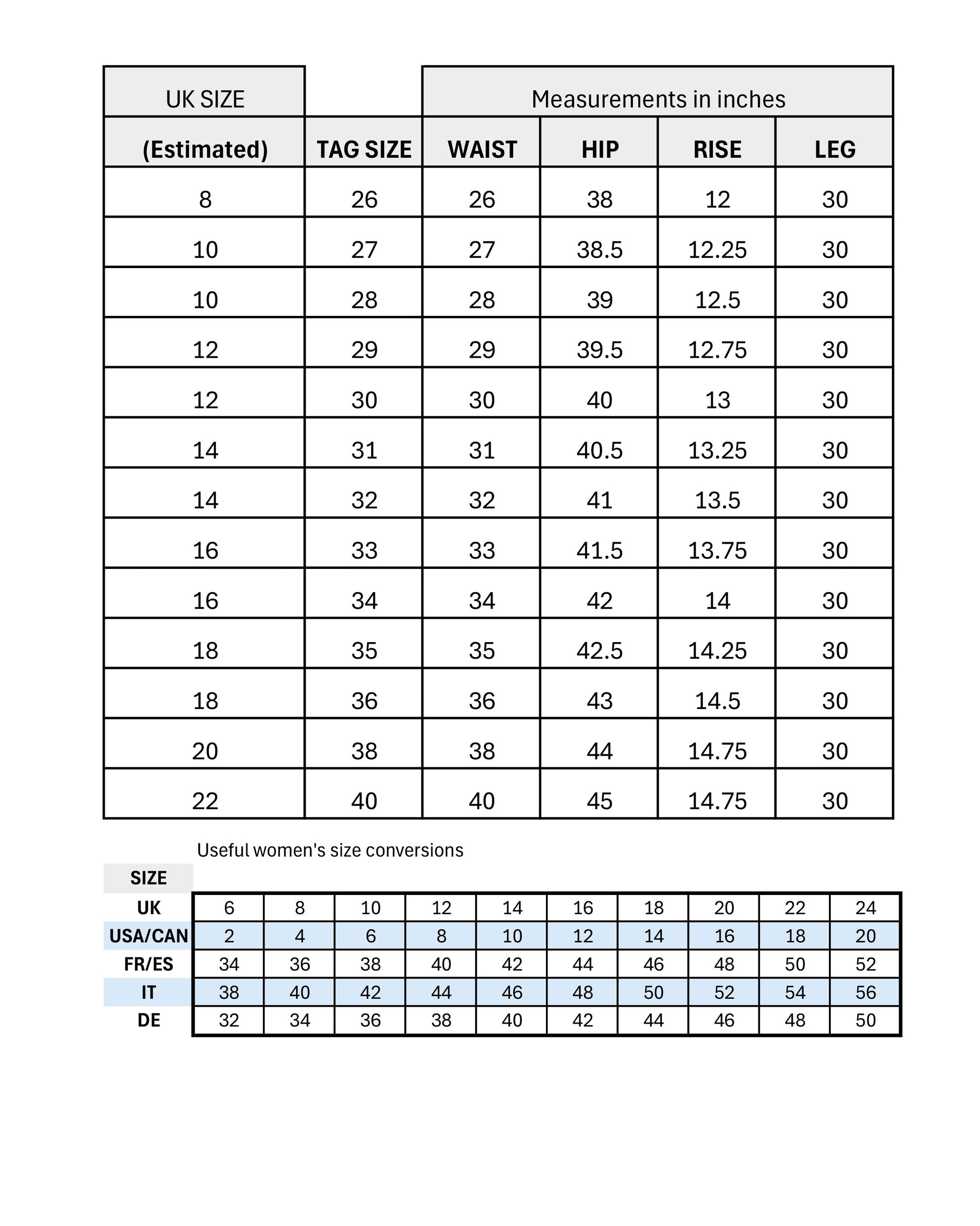 Approx ladies UK size conversions