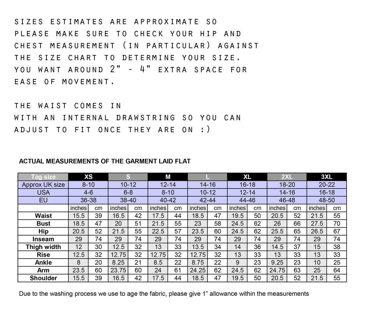 See size chart for full size info. The fit of these very much depends on your hip measurement so please use this as you main guide. Please don't forget that you make these fit your shape using the internal waist drawstring!! It's easy to miss but it's an essential part of the design :)