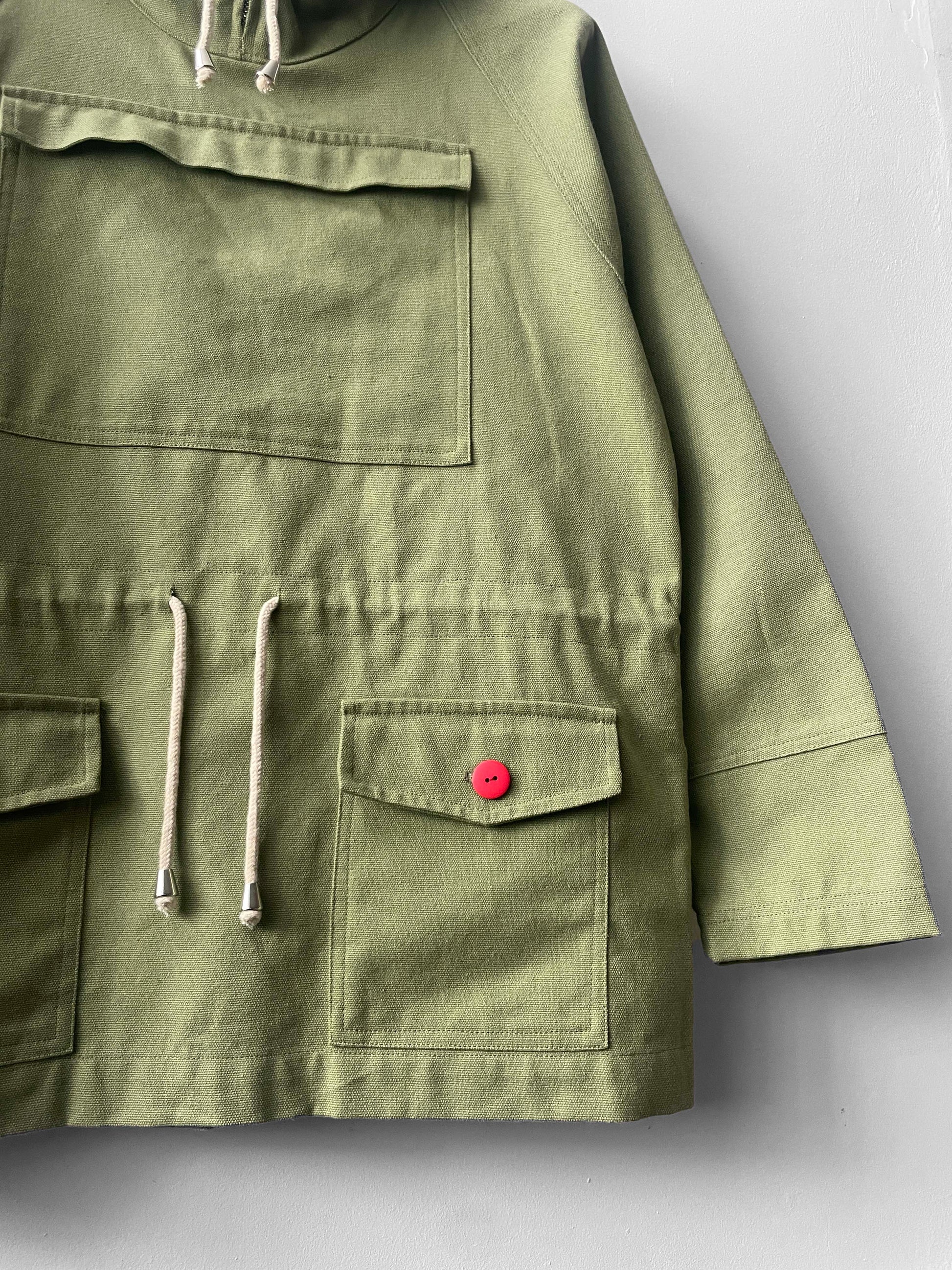 Green Cadet Smock Cotton Canvas Red Buttons - Small