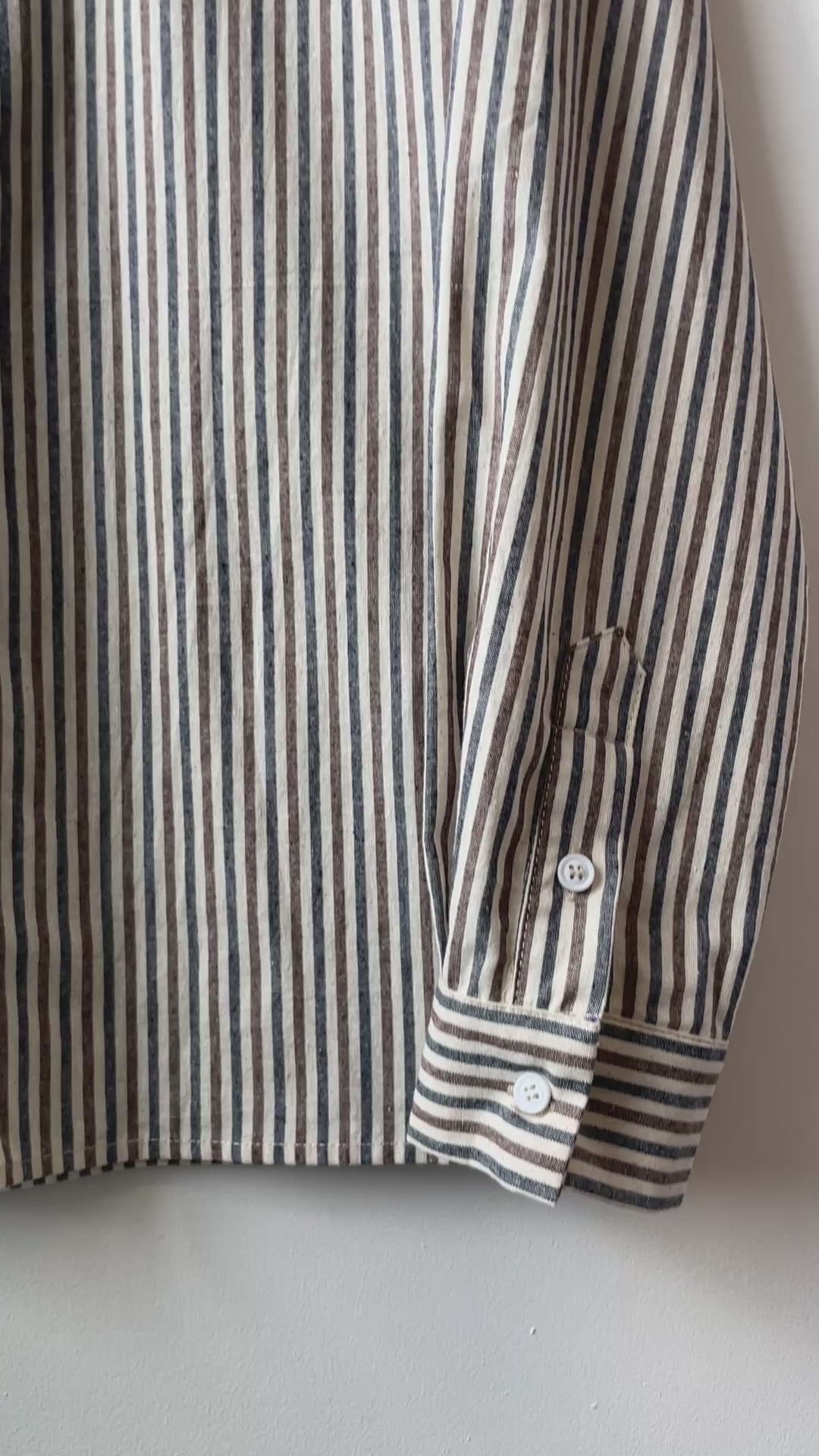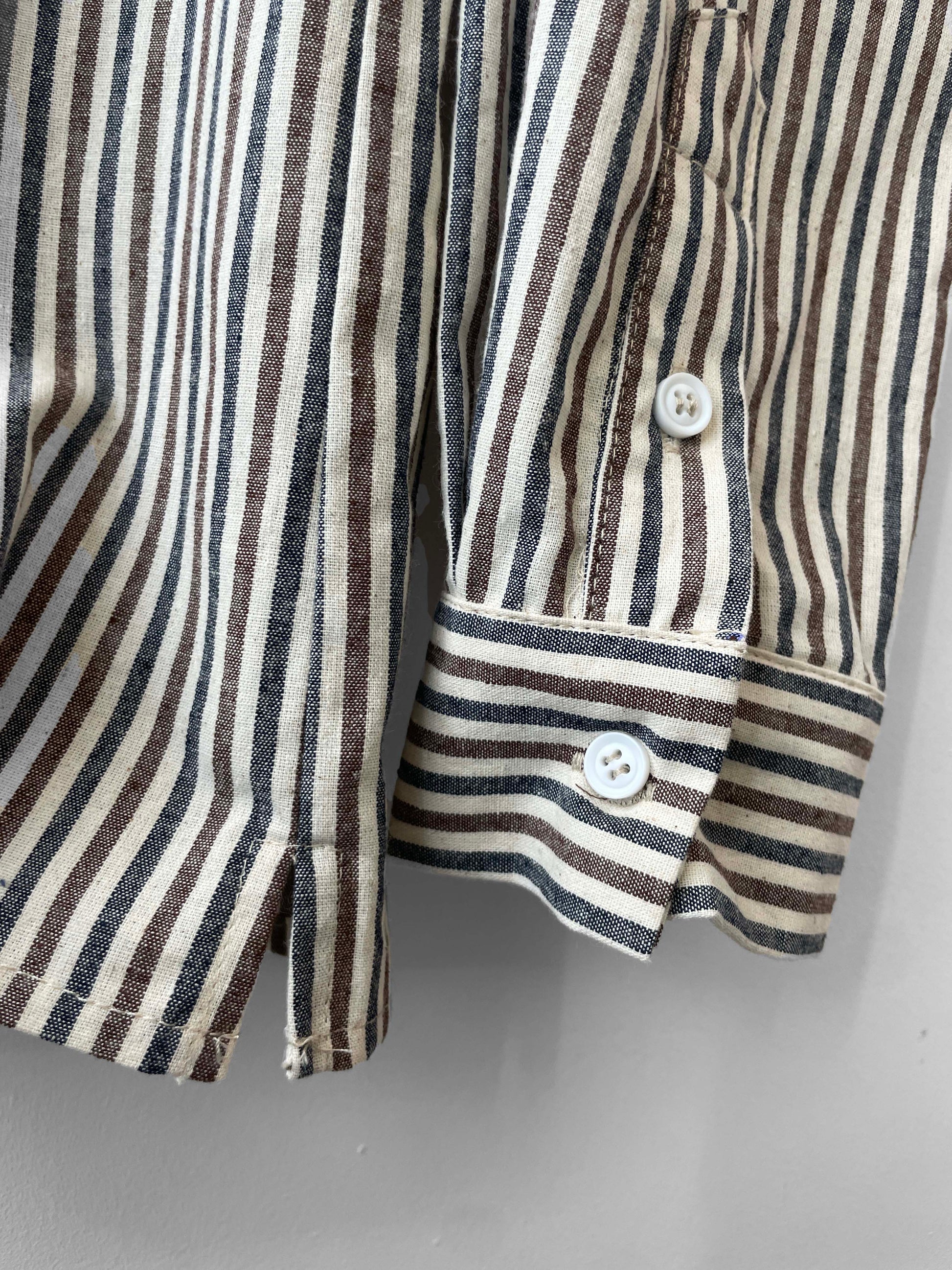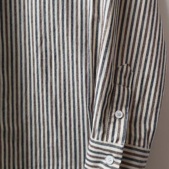 Unisex Striped Button Down Ticking Shirt Brown & Blue - Collarless Grandad Smock - 100% Cotton - Long Sleeve Chore Shirt